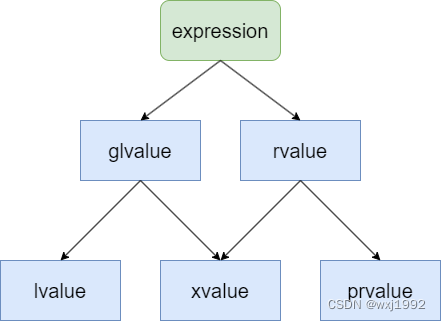 glvalue、rvalue:都是generalized,广义左值、广义右值,因为包含了xvalue xvalue:expired value,消亡值,常常是临时表达式,如实参里的新对象; pure rvalue = prvalue: 纯右值和lvalue类似