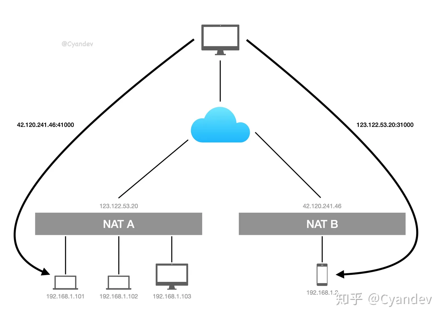 打洞,是利用了NAT把内网设备和公网通讯的原理用成了 和 另一个NAT设备通信(看成公网了),当然中间需要让NAT设备完成NAT转换,也就是记录发包走向映射表的建立,具体如下: :::success ! 最关键的一步,打洞。 设备 1 向 42.120.241.46:41000 发一个包,NAT B 自然能接收到这个包,然而它不知道来自 NAT A 的包应该发给谁,因此 NAT B 将这个包舍弃。但是由于设备 1 向 42.120.241.46:41000 发过包,NAT A 会记录:以后来自 42.120.241.46:41000 的包都发给设备1。 设备 2 也做相同的操作,让 NAT B 也知道:以后来自 123.122.53.20:31000 的包都发给设备 2。 至此,NAT A 与 NAT B 都互相为对方保留了端口,就可以愉快地通讯了。