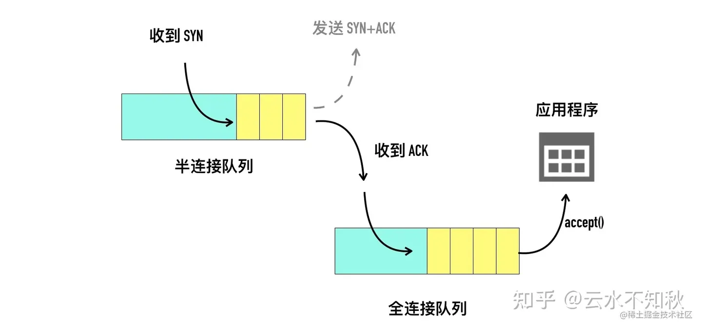 客户端connect 开启第一次握手 listen()获取到结果 第二次握手,进入半连接队列 最后一次ack后进入established,进入全连接队列(内核通过五元组绑定找到对应的半连接队列,然后搬迁)